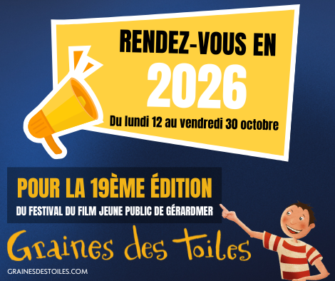 Prochaine édition en 2026 La 19ème édition du Festival du Film Jeune Public Graines des Toiles de Gérardmer aura lieu du lundi 12 octobre au vendredi 30 octobre 2026. Le thème de cette édition 2026 sera dévoilé prochainement !